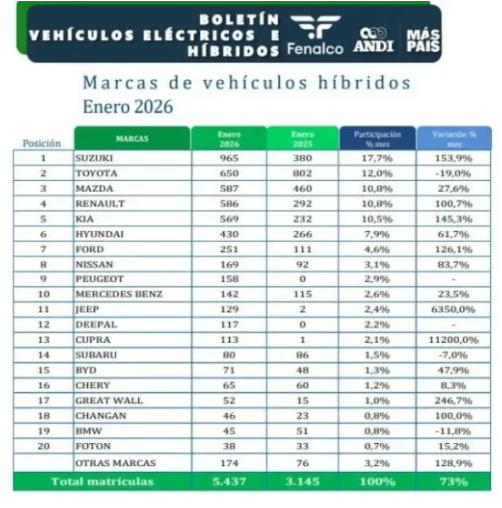 - Los vehículos híbridos aumentaron 73%, con 5.437 unidades matriculadas, también con una participación cercana al 27% del mercado mensual.